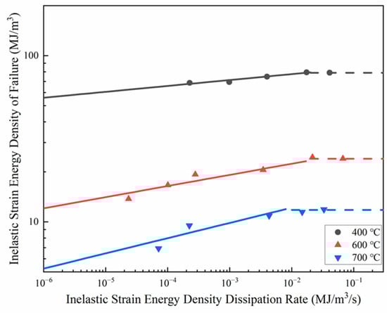 As shown in Figure 11, for medium-silicon molybdenum ductile iron at 400 °C, 600 °C, and 700 °C, when is below 0.02 MJ/m3/s, 0.015 MJ/m3/s, and 0.01 MJ/m3/s, respectively, increases with increasing values. However, as continues to rise, begins to stabilize or slightly decrease due to the reduced creep ductility of the material under high stress, as indicated by the dashed lines in Figure 11. Consequently, the critical inelastic strain energy density () values for medium-silicon molybdenum ductile iron were determined to be 79 MJ/m3, 24 MJ/m3, and 11.5 MJ/m3 at 400 °C, 600 °C, and 700 °C, respectively.