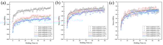 In Figure 8, it can be observed that changes in the strain amplitude do not significantly alter the overall shape of the hysteresis loops. The peak and valley stress values at small strain amplitudes generally fall near the stress values corresponding to larger strain amplitudes, indicating that creep–fatigue interaction does not substantially affect this material’s plastic constitutive relationship. Regarding the influence of the hold time, the duration has a minor effect on the shape of the hysteresis loops. The primary reason for this is that the stress relaxation during the initial stage of the hold period is greater than that during the other stage. Consequently, the additional stress relaxation from longer hold times is relatively small, resulting in a minimal impact on the loop shape. However, if the hold time were substantially increased beyond the current experimental conditions, the incremental stress relaxation would become more pronounced compared to the shorter hold times, leading to more noticeable changes in the hysteresis loop shape. Additionally, it is evident that the stress relaxation per unit time gradually decreases with a prolonged hold time, meaning that the influence of the hold time on the loop shape diminishes over time.