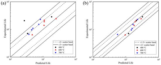 Regarding the TF model shown in Figure 13a, the predictions yielded relatively satisfactory results at 600 °C, with all data points falling within the 2× scatter band. However, the predictions were less accurate at other temperatures. Overall, the predictions across all temperatures tended to be conservative, with some data points at 700 °C approaching the 3× scatter band. Notably, for one condition (400 °C, 0.4%, and 60 s), the prediction exceeded the 10× scatter band. This discrepancy arose because the TF model considers creep to be solely dependent on stress and time, and according to Equation (5), life exhibits a power-law relationship with stress, meaning higher stress leads to a shorter life. In this study, this approach overestimated creep damage during the initial high-stress phase of the dwell period. Furthermore, even after stress relaxation stabilized during the prolonged dwell times, creep damage continued to accumulate. For stress relaxation that maintained relatively stable higher stress levels during the dwell period, the relatively high stable stress resulted in overestimated creep damage, leading to conservative predictions.