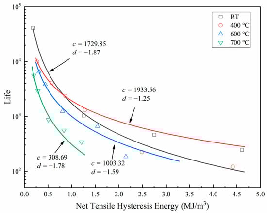 Previous LCF tests have established the relationship between fatigue life and strain using the Basquin–Manson–Coffin equation. While this equation offers simplicity and versatility, it calculates fatigue life solely based on strain as the life parameter, neglecting the influence of stress responses at elevated temperatures. To address this limitation, researchers have proposed alternative approaches that correlate the external energy put into a material with low-cycle fatigue life [39]. These energy-based methods are generally thought to better reveal the fundamental nature of low-cycle fatigue damage, offering a clearer picture of its physical significance and improved accuracy compared to the Manson–Coffin equation.