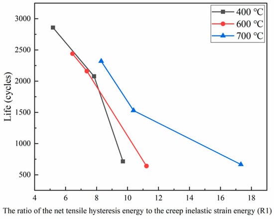 An analysis was conducted from an energy perspective. Ratio R1 was obtained by dividing the net tensile hysteresis energy by the creep inelastic strain energy in the creep–fatigue hysteresis loops at various strain amplitudes. The relationship between creep–fatigue life and R1 at different temperatures is presented in Figure 15. The results show that at all temperatures, R1 gradually increases with an increasing strain amplitude, while the creep–fatigue life decreases with an increasing R1. This indicates that the fatigue damage caused by an increasing strain amplitude plays an important role in creep–fatigue damage. However, as the strain amplitude increases, the curves show different trends at different temperatures. For example, at 400 °C, R1 increases from 7.84 to 9.70 and the life decreases by 1364 cycles. In contrast, at 700 °C, R1 increases from 10.38 to 17.32, but the life only decreases by 865 cycles. This demonstrates that as temperature increases, the influence of net tensile hysteresis energy damage on life caused by strain amplitude changes decreases. Correspondingly, it also indicates that the influence of creep inelastic strain energy on life increases. These findings are consistent with the actual situation, where creep effects become stronger at higher temperatures.