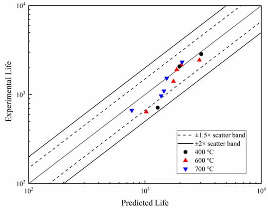 As shown in Figure 16, the LDS damage accumulation approach combining the T-SEDE and Ostergren methods demonstrates satisfactory life prediction accuracy, with only two data points exceeding the 1.5× scatter band. This result confirms the effectiveness of this combined method for life prediction.