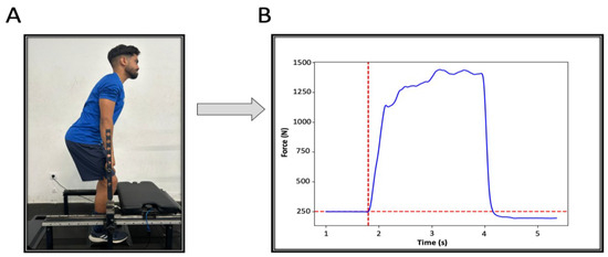 (A) Isometric Mid-Thigh Pull (IMTP). (B) Force–time curve of the IMTP exercise using a Python routine implemented in Visual Studio Code, the blue line represents the force-time curve, while the red line indicates the onset of force production.