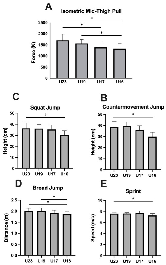 Comparison of test performances between age groups. (A) Isometric Mid-Thigh Pull performance in Newtons with significant differences (*) between U23 and U16 (p = 0.001), U23 and U17 (p < 0.001), and U19 and 16 (p = 0.007); (B) Countermovement Jump height with significant differences (#) between U23 and U16 (p < 0.001), U19 and U16 (p < 0.001), and U17 and U16 (p = 0.003); (C) Squat Jump height with significant (#) differences between U23 and U16 (p < 0.001), U19 and U16 (p < 0.001), and U17 and U16 (p < 0.001). (D) Broad Jump distance with significant differences (*) between U23 and U16 (p = 0.002), and U19 and U16 (p = 0.008); (E) sprint speed with significant differences (#) between U23 and U16 (p = 0.002), U19 and U16 (p < 0.001), and U17 and U16 (p < 0.001).
