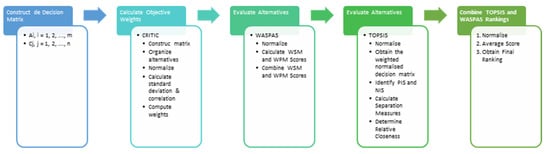 With the information consolidated, the next step is calculating the weights for the considered criteria. Then, alternatives are evaluated using WASPAS and TOPSIS with their respective procedures; we need to normalize the data from the associated calculations in both cases. Finally, a score to rank the alternatives is calculated. In the following subsections, we discuss the mathematical details of each method.