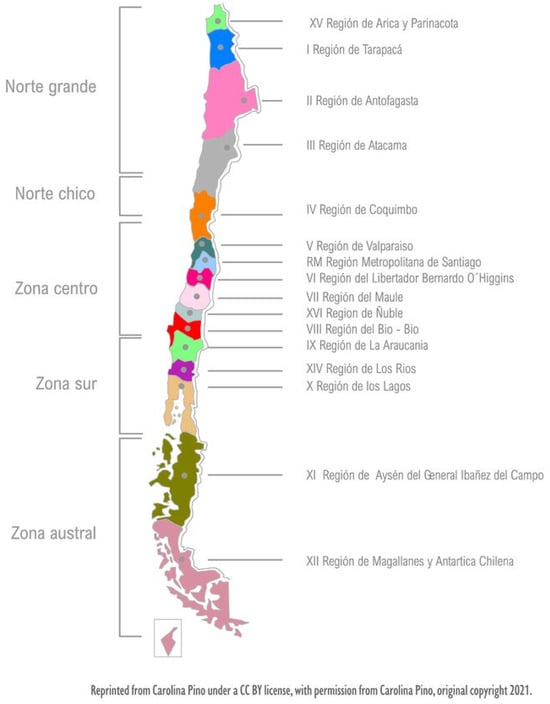 Chile, a long and narrow country spanning desert to sub-Antarctic regions and dominated by the Andes, presents unique diversity in Latin America (see Figure 2). With a population of 19,658,835 [71], Chile’s economy is based on raw material exports and a growing service sector. Geologically, it experiences high seismic and volcanic activity due to its location on the Pacific Ring of Fire as well as its climatic diversity, ranging from the Atacama Desert to temperate rainforests. Chile regularly faces natural risks like earthquakes, volcanic eruptions, tsunamis, avalanches, droughts, and forest fires, which are increasing due to climate change, rising temperatures, decreasing rainfall, and more frequent extreme events. This has significant impacts on sectors like agriculture, energy, and water resources. Socioeconomically, wealth concentration and inequality increase vulnerability to natural disasters, while accelerated and disorderly urbanization lead to overcrowding, a lack of services, and greater exposure to risks.