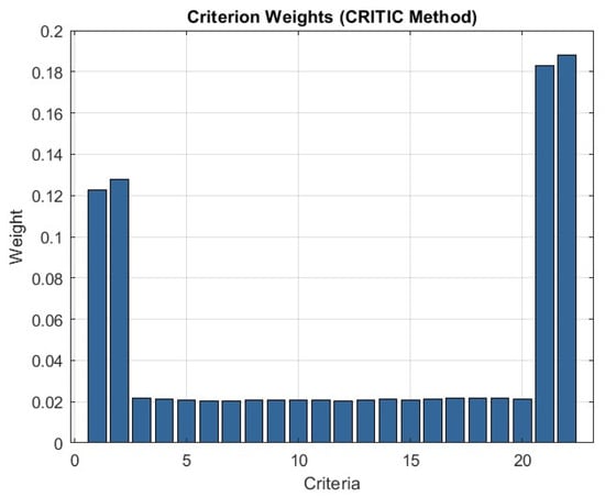 CRITIC determines the weights for criteria based on contrast intensity (relative to the variability in the data) and correlation or conflict between criteria [67] and is applicable to ensure a balanced and data-driven weighting system. The weight increases when the standard deviation is higher, indicating greater discriminative power in the criterion. Conversely, a lower correlation with other criteria manifests less redundancy and increases the weight. We obtained the weights for the criteria by calculating the product of standard deviations and the sum of the complements between criteria.