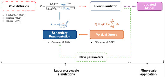 - Castro, R.; Gómez, R.; Castillo, J.J.; Jerez, O. Fragmentation model integrated in a gravity flow simulator for block caving planning. Granul. Matter 2024, 26, 20–22. [Google Scholar] [CrossRef]