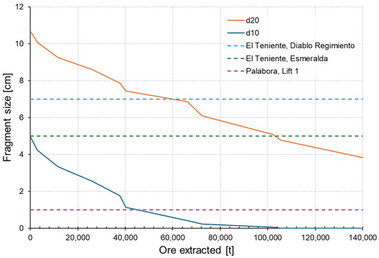 - Pierce, M.; Fuenzalida, M. Application of a methodology for secondary fragmentation prediction in cave mines. In Proceedings of the 3rd International Symposium on Block and Sublevel Caving, Santiago, Chile, 5–6 June 2014; pp. 318–327. [Google Scholar]
