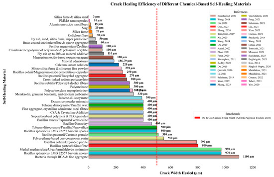 Crack healing efficiency of various chemical-based self-healing materials, showing the maximum crack width that each material can heal. The red dashed line (500 µm) represents the benchmark crack width in oil and gas cement applications, with some materials exceeding this threshold, offering potential for enhanced cement integrity [29,32,33,52,53,54,55,56,57,58,59,60,61,62,63,64,65,66,67,68,69,70,71,72,73,74,75,76,77,78,79,80,81,82,83,84,85,86,87].