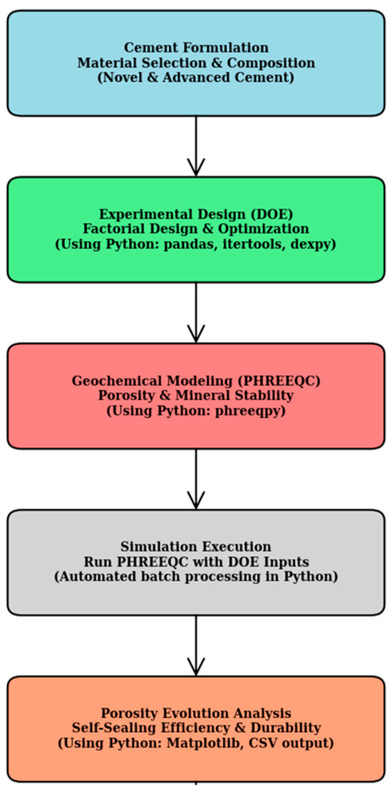 Methodology workflow for self-healing cement development. The workflow illustrates the step-by-step process integrating experimental design, computational geochemical modeling, and data analysis for optimizing self-healing cement formulations. The methodology includes cement formulation, factorial design of experiments (DOE) using Python 3.13 (pandas, itertools, dexpy), geochemical modeling with PHREEQC (phreeqpy library), simulation execution using automated batch processing, and porosity evolution analysis leveraging Matplotlib 3.1 and CSV output processing. This workflow provides a structured approach for evaluating self-sealing efficiency, mineral stability, and long-term durability of cement in CO2-rich environments.