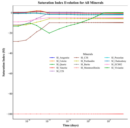The saturation index (SI) trends, presented in Figure 5, provide critical insights into mineral stability and precipitation dynamics throughout the simulation period. Key observations include the following: