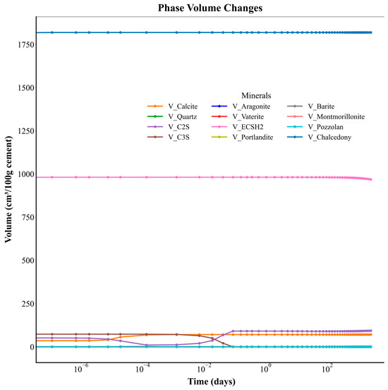 Phase volume changes in key minerals over time, demonstrating the stability of ECSH2 and Chalcedony in self-healing cement formulations under CO2-rich conditions, ensuring sustained mechanical integrity and resistance to degradation. Observable volume evolution in Calcite, Quartz, C2S, C3S, Vaterite, Portlandite, and Pozzolan confirms active dissolution–precipitation reactions. Barite and Montmorillonite exhibited negligible volume change during the simulation.