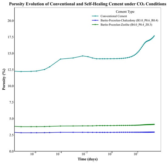 Porosity evolution over time for different cement systems under CO2 conditions. The conventional cement (teal) shows significant porosity increase (~12–18%), while the Barite–Pozzolan–Chalcedony mix (blue) maintains lower porosity (~3%) and the Barite–Pozzolan–Zeolite mix (green) remains slightly higher (~4%), both with minor increases over time.