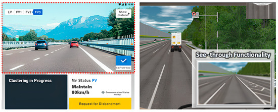 The see-through functionality enables the leading vehicle of the platoon to transmit real-time forward-facing traffic footage to the following vehicles. The leading vehicle captures the real-time traffic situation and transmits it to the following vehicles through V2X communication. The following vehicles display the footage through a human–machine interface (HMI), allowing drivers to recognize the traffic situation ahead of the platoon. This functionality could contribute to enhancing the psychological stability of following drivers under distressing conditions such as abrupt braking.