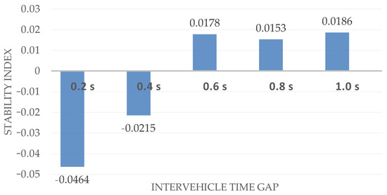 Although the stability index slightly decreased when the time gap increased from 0.6 s (15 m) to 0.8 s (20 m), the variation was statistically insignificant. A graphical representation of the stability index according to different intervehicle time gaps is shown in Figure 3.