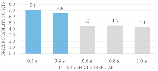 The survey results showed a trend similar to that of the stability index derived from the driving simulator experiments. Specifically, as the time gap increased, the Driver Stability points decreased, indicating a reduction in the anxiety level. Notably, when the time gap was reduced to less than 0.6 s (15 m), the anxiety level significantly increased; whereas, when the time gap exceeded 0.6 s, the improvement in psychological stability was marginal. This trend is consistent with those of the stability index analysis.