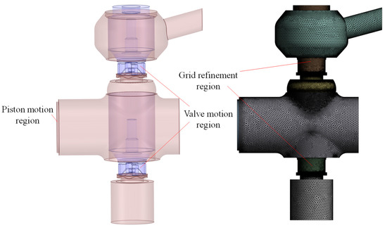 The three-dimensional computational fluid dynamics (CFD) domain, encompassing internal flow channels and cavities, is constructed in full compliance with moving mesh requirements while maintaining topological consistency, as shown in Figure 2 (left). Mesh generation employs unstructured tetrahedral elements with progressive grid adaptation (minimum cell size Δxmin = 0.27 mm, growth rate 1.15) along valve disc trajectories, enabling the resolution of transient flow characteristics. As shown in Figure 2 (right), the final grid configuration achieves the quality metrics required for the computation, as follows: average skewness < 0.85, orthogonal quality > 0.35, aspect ratio < 3.15.