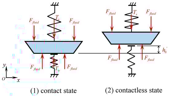 Valve actuation follows a force-dependent regime: opening initiates when the resultant pressure differential force surpasses the cumulative resisting forces, while closure commences under force inversion conditions. The force transmission dynamics are principally dictated by the interfacial contact mechanics between the disc guidance assembly and the impact-bearing plate, as schematically depicted in Figure 3. The spring force is modeled as a linear function of displacement based on Hooke’s law, assuming small deformations and isotropic material properties. Frictional damping effects between the spring coils are neglected. The kinematic behavior of the valve disc can be mathematically described by the following second-order differential equation: