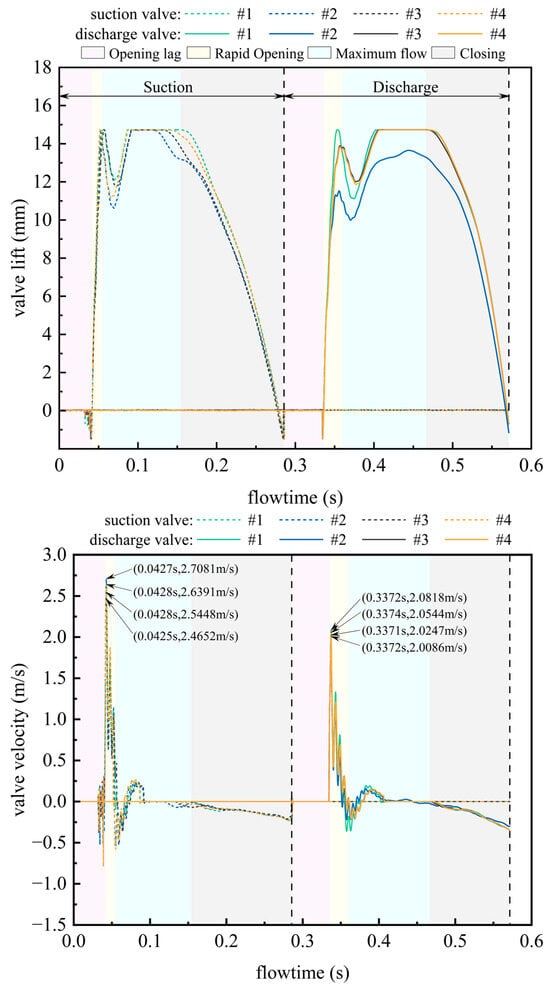 Figure 6 delineates the temporal evolution of valve lift and velocity profiles under structural parameters. Both suction and discharge valves demonstrated instantaneous opening responses, marked by characteristic velocity spikes (peak magnitudes > 2.0 m/s) indicative of jump phenomena. Suction valves exhibited 30.08% higher mean maximum velocities compared to discharge valves. Discharge valves displayed 53.78% greater closure hysteresis relative to their suction counterparts during pressure equilibration phases.