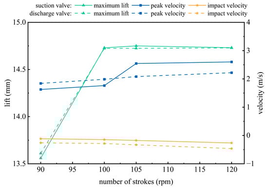 Valve motion analysis (Figure 6) identifies distinct operational signatures: instantaneous opening responses manifest as velocity spikes (>2.0 m/s), characteristic of mechanical jump phenomena. The 30.08% higher mean maximum velocity in suction valves versus discharge valves reflects inherent system asymmetry. Notably, discharge valves exhibit 53.78% greater closure hysteresis during pressure equilibration, highlighting phase-dependent dynamic challenges. The number of strokes has a significant effect on the maximum lift, peak velocity, and impact velocity of the pump valve. The results provide a reliable reference for adapting the operating parameters to extend the service life of the pump valve.