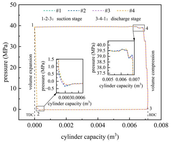 The diagnostic framework confirms stable cyclic operation across configurations (Figure 8), with pressure transitions at critical stroke points (Point 1: 39.298 MPa; Point 2: −0.348 MPa) demonstrating minimized closure hysteresis. The maintained circulation area validates operational integrity, while phase-correlated expansion/compression profiles reflect liquid compressibility and cylinder wall elasticity interactions.