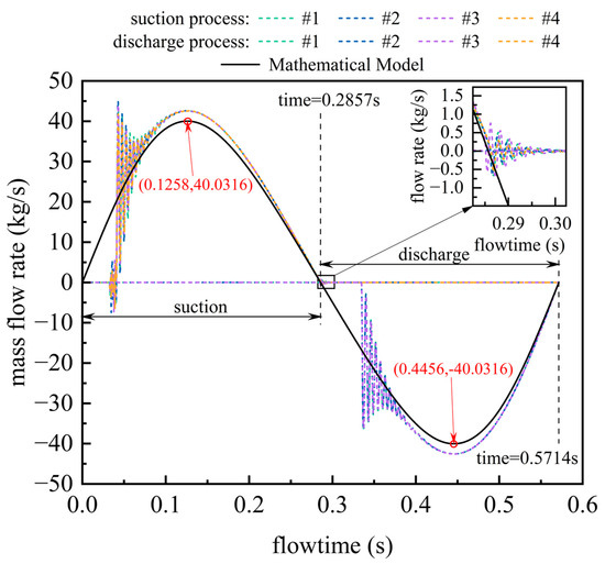 Transient flow simulations revealed critical deviations between parametric configurations (Figure 9) and theoretical predictions (Qt_max = 40.0316 kg/s): steady-phase flow rates exhibited <6% deviation, while valve transition periods showed 113.4–114.1% discrepancies due to kinematic hysteresis (valve lag time: 0.04–0.05 s). Maximum simulated flow rates exceeded theoretical values by 6.3 ± 0.1%, correlating with amplified pressure differentials (Δpmax = 39.6 MPa) during delayed valve actuation. Valve disc velocity fluctuations synchronized with flow perturbations (Figure 6). The characteristics of the flow change when the pump valve is closed (magnified insets) show that, when the valve disc falls back to the seat, the valve flap movement oscillates due to the cushioning effect of the wave springs, resulting in a flow disturbance.