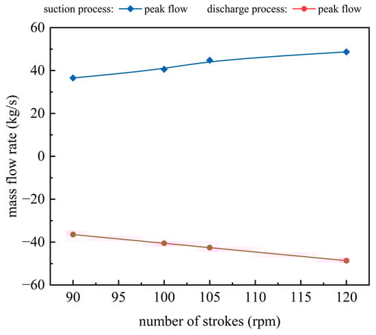 Transient flow simulations elucidated the non-linear relationship between peak flow and stroke frequency (Figure 10). The parametric analysis shows that the peak flow rate in the suction/discharge phase increases simultaneously by more than 30% when the operating revolutions increase from 90 rpm to 120 rpm. This parametric response validates the active displacement control strategy presented in [1,2], which identifies stroke number as the main operating determinant for flow optimization.