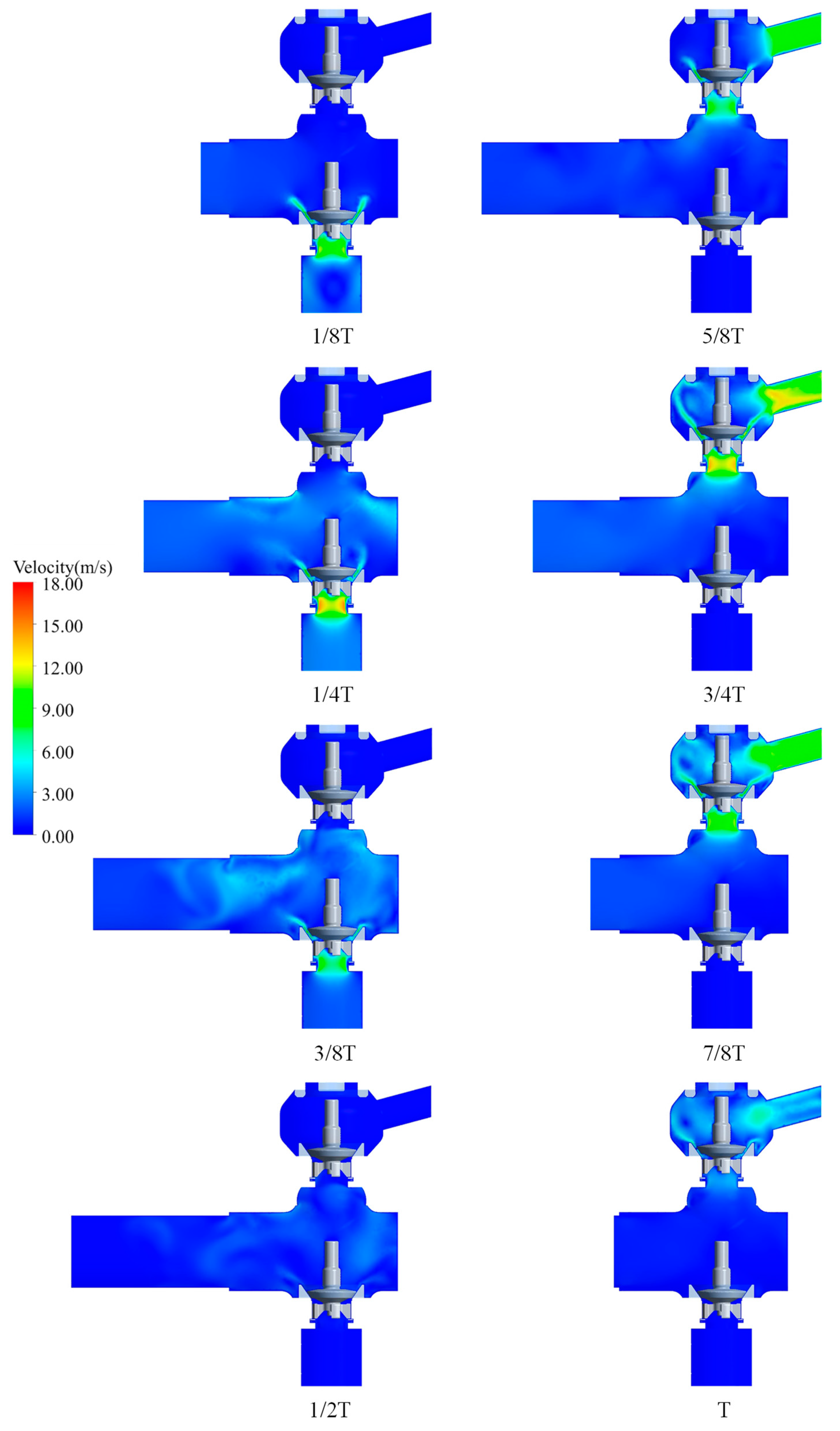 The integrated kinematic fluid dynamic analysis delineated flow characteristic during a complete operational cycle (T = 0.5714 s). Transient velocity distribution contours (Figure 5) exhibited near-zero magnitudes in discharge valve clearance regions (<0.01 m/s) throughout the suction phase, confirming complete sealing integrity with no detectable fluid bypass. Symmetrical flow suppression occurred in suction valve regions during discharge operations, further corroborating the clearance model’s ability to emulate physical valve closure mechanisms.