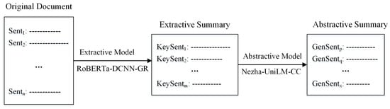 Extraction–abstraction two-stage framework. “-” represents a Chinese character in a sentence.