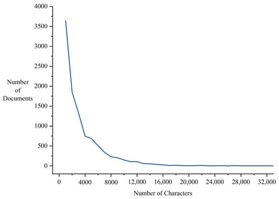 This paper utilizes 10,153 maritime judgment documents publicly available on China Judgments Online (https://wenshu.court.gov.cn/, accessed on 13 March 2023) as the data source, covering cases from 11 maritime courts, including those in Dalian, Tianjin, and Shanghai. The textual length distribution of the corpus is shown in Figure 2, where the horizontal axis represents the number of characters in the judgment documents, and the vertical axis denotes the number of documents with the corresponding character count. It shows that the corpus exhibits a pronounced long-text characteristic: the average document length is 3006 characters, with 18.77% (1906 documents) exceeding 5000 characters.