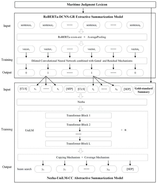 The main contributions of this paper are as follows: (1) to address the complexity and specialization of maritime judgment documents, we constructed a maritime judgment lexicon by extracting terms such as laws, regulations, and international conventions in real legal documents. This lexicon resolves terminological ambiguities caused by conventional tokenization tools and improves term consistency and legal compliance in the generated summaries. (2) Targeting the challenge of lengthy maritime judgments, we propose HybridSumm, a hybrid “extraction–abstraction” summarization framework based on the maritime judgment lexicon. The term “extraction–abstraction” refers to the framework’s integration of the information filtering capability of extractive models with the semantic reorganization advantages of abstractive approaches. Specifically, in the extraction stage, the RoBERTa-DCNN-GR model (see Section 4.1) is employed to select key sentences from lengthy judgment documents. It uses a RoBERTa-wwm-ext-based semantic encoder, multi-layer dilated convolutional neural networks (DCNNs) and gated residual mechanisms (GR) for precise long-text compression to ensure complete retention of legally critical facts. In the abstraction stage, the Nezha-UniLM model (see Section 4.2) refines the semantic representation of these extracted key sentences. Nezha’s encoder, equipped with relative positional encoding, systematically analyzes complex legal text structures to capture hierarchical dependencies, whereas the UniLM decoder generates coherent sequences through dynamic attention masking, ensuring contextual consistency. To address technical challenges such as out-of-vocabulary (OOV) terms and repetitive generation, a pointer–generator network is integrated, with its copy mechanisms directly handling OOV issues and a coverage mechanism actively suppressing redundancy. These components collectively transforms key sentence summaries into logically coherent and legally standardized outputs. As illustrated in Figure 1, this collaborative architecture effectively balances information integrity and expressive fluency. Detailed technical implementations of each component are elaborated in Section 4.