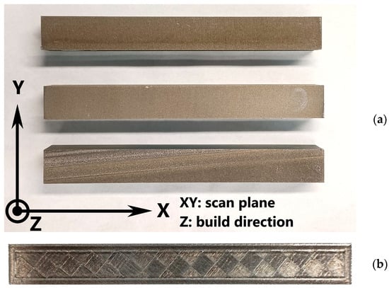 The selective laser-melted alloy 625 was provided in the as-built condition in the form of bars printed horizontally, as shown in Figure 2. The dimensions of the transversal section were 12.5 mm × 12 mm, and the length was equal to 100 mm. The adopted bars were manufactured for each layer using the island scanning strategy, thus forming a chessboard pattern with a layer thickness of 30 μm, and the laser parameters are summarized in Table 3. The printing parameters were optimized by the producer aiming to minimize the residual porosity and improve the mechanical characteristics.