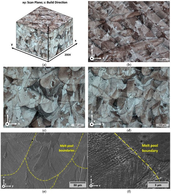 Micrographs of the selective laser-melted material in the as-built condition obtained via light optical and scanning electron microscopy. Figure (a) reports an overview of the microstructural features on three perpendicular planes. The melt pools on the three planes are shown in (b–d). SEM observation of the melt pools are reported in (e,f): dendrites with different orientations are visible in (f).