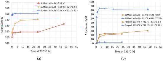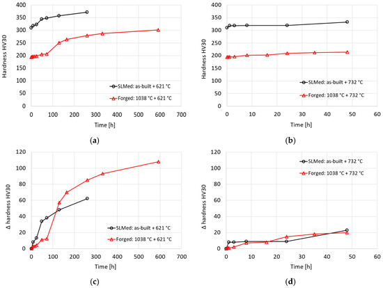 Hardness curves after single-aging treatments at 621 °C (a,c) and 732 °C (b,d) of the selective laser-melted alloy in comparison to the conventional forged one. The hardness increase induced by the aging treatment is significantly less for the SLMed specimens, even if their hardness always remains higher than that of the forged material. The standard deviation values range from 1 to 5 HV30.