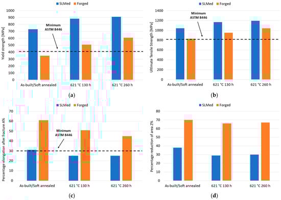 Room-temperature tensile properties after single-aging treatments at 621 °C of the conventional forged and soft-annealed alloy 625 [43,44] and the selective laser-melted one. Figures (a,b) report the yield strength (a) and the ultimate tensile strength (b) in selected conditions. The mechanical properties of the as-built material are significantly higher than those of the conventional forged alloy. Figures (c,d) report the percentage elongation after fracture A% (c) and the percentage reduction of area Z% (d). Tensile deformability is lower and even below the standard minimum requirement for the aged conditions. The standard deviation values for YS and UTS range from 2 to 13 MPa and from 1 to 2% for A% and Z%.