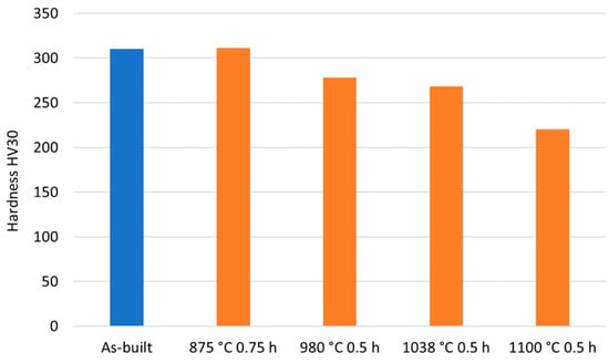 Hardness variation after high-temperature annealing from the as-built condition. It is due to the recrystallization phenomena occurring during the heat treatment. The standard deviation values range from 1 to 3 HV30.