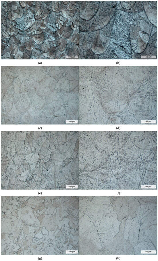 Optical micrographs on the ZY plane at 200X (a,c,e,g) and 500X (b,d,f,h) of the selective laser melted material after annealing at different temperatures from the as-built condition: (a,b) 875 °C 45 min; (c,d) 980 °C 0.5 h; (e,f) 1038 °C 0.5 h; (g,h) 1100 °C 0.5 h.