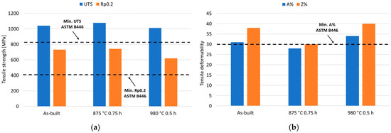 Room-temperature tensile strength (a) and tensile deformability (b) after heat treatment at 980 °C for 0.5 h compared to the as-built condition and to those obtained at the stress-relieving temperature recommended by the standard (875 °C). The mechanical resistance is slightly less than that of the as-built and 850 °C stress-relieved conditions, but the tensile deformability is improved and superior to the minimum standard requirement. The standard deviation values for YS and UTS range from 3 to 12 MPa and up to 1% for A% and Z%.