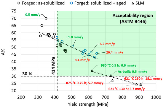 Performance map relating the tensile and corrosion properties of the conditions tested in this work for the selective laser-melted material and in our previously published papers [43,44] for conventional forged alloy 625. The green shaded area corresponds to the acceptability region with respect to the minimum standard requirements for the tensile properties (ASTM B446 [12]). The data labels report the corrosion rate in mm/year according to the ASTM G28—Method A standard [38] (green label: acceptable; red label: not acceptable). The standard deviation values range from 2 to 14 MPa for YS and from 1 to 2% for A%.