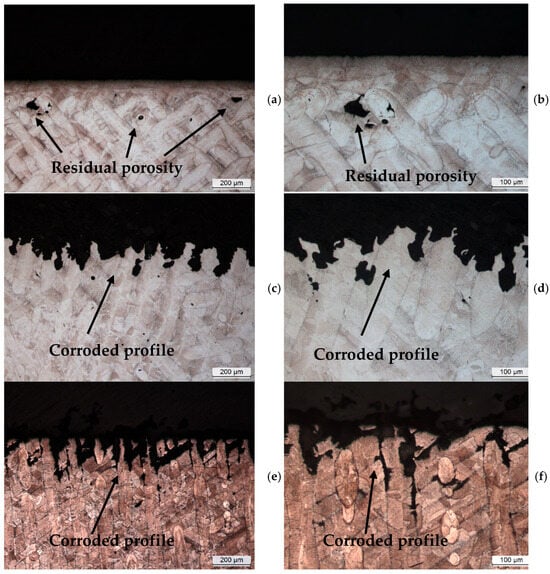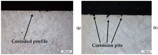 Figure 11 shows some sections of the specimens subjected to the corrosion tests cut perpendicularly to the surfaces exposed to the corroding solution. Figure 11a,b represent the as-built condition. Some residual porosity is visible, but no corrosion damage characterizes the surface. The corresponding corrosion rate is in fact very low (0.5 mm/year). Pictures c and d are instead related to specimens aged at 621 °C for 130 h. Unlike the as-built condition, the surface clearly shows the effects of the corroding solution. The corrosion attack follows the laser tracks’ borders preferentially, even if the damage includes the inner zones as well. Accordingly, the corrosion rate (5.7 mm/year) was much higher than of the as-built one. The effect of the standard stress-relieving temperature (850 °C) on corrosion resistance is clearly detrimental, as shown in Figure 11e,f. Similarly to the aged condition, the corrosion damage proceeds along the laser track direction and removes material both from the border and the inner part of the track. Also, in this case, the corrosion rate is quite high (5.7 mm/year). Finally, the new heat treatment at 980 °C resulted in a corrosion rate (0.6 mm/year) very similar to the as-built one. The corrosion pits reported in Figure 11g,h were in fact very small on all the corroded surface.