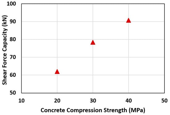 - The findings indicated a clear trend in which shear force capacity increased with concrete compressive strength, confirming that higher compressive strength enhanced the resistance of AA RC beams to shear-induced cracking and failure. The shear force capacity increased from 124.1 kN to 181.4 kN, with increasing concrete compression strength from 20 MPa to 40 MPa.