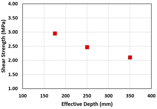 - The findings on the effect of beam size designated that there was an inverse relationship between shear strength and the effective depth. The shear strength decreased from 2.95 MPa to 2.1 MPa as the effective depth increased from 175 mm to 350 mm.