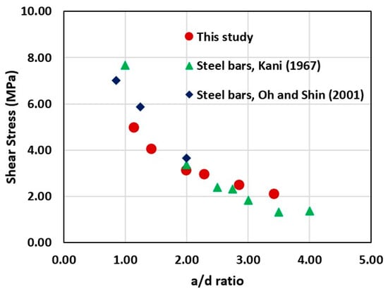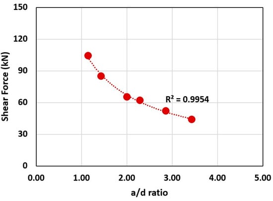 - The inverse correlation between the shear force and a/d ratio was also obtained. A reduction in the a/d ratio from 3.43 to 1.14 instigated an increase in shear force from 43.9 kN to 104.4 kN. This was also aligned with the fundamental shear mechanism in RC beams [32], where increasing the a/d ratio typically instigated a reduction in shear force capacity because of the transition from a shear to a flexure failure mode.