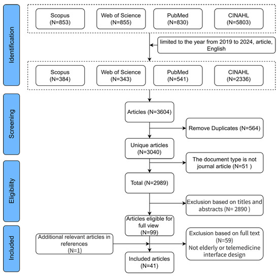 This review combines relevant articles from the domains of telemedicine, human–computer interactions, and usability evaluation. To ensure the comprehensiveness and accuracy of the sample data, retrieval strategies, methods, and principles were established [42,46]. Adhering to the Preferred Reporting Items for Systematic Reviews and Meta-Analyses (PRISMA) checklist, a systematic review on telemedicine for older adults was conducted to identify key elements for improving interfaces and assessing their usability. PRISMA offers researchers a clear reporting standard that includes a 27-item checklist and a flowchart, designed to improve transparency and integrity in research design, implementation, and analysis [47]. The PRISMA framework is employed to refine the research scope and identify key areas for peer review.