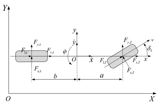 According to the literature [32], the expression of a three-degree-of-freedom vehicle dynamics non-linear model based on a linear tire model can be expressed as