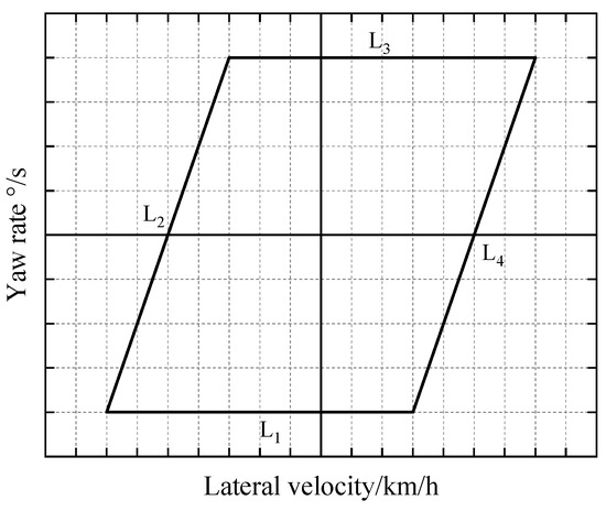In the phase plane of the yaw rate/lateral velocity, a closed stability boundary can be constructed by employing Equations (11) and (12), as illustrated in Figure 2. The extent of the boundary is influenced by the longitudinal speed of the vehicle and the side deflection angle of the rear wheel. Specifically, the stability boundaries L1 and L3 are constrained by Equation (11), whereas the stability boundaries L2 and L4 are subject to the constraints imposed by Equation (12). When the vehicle’s state variables lie within the stability boundary, driving stability can be ensured.