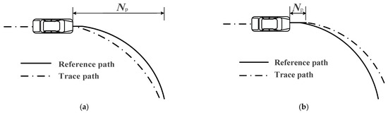 In the MPC controller, the prediction horizon Np indicates the number of future time steps the system predicts, and the control horizon Nc represents the number of groups of control increments the system solves in a control cycle. As shown in Figure 3, when Np is large, the controller can predict a longer period, but the weight assigned to tracking errors far from the current position will be greater, leading to an increase in the cumulative error and heightened complexity in controller solution. When Np is small, the controller has a lower calculation burden, enabling faster system response and higher real-time performance. However, the predicted distance is too short, which reduces system responsiveness to the future. Under the constraint of the controller on the front wheel angle, the vehicle may fail to turn in time, leading to path tracking failure. When Nc increases, the sensitivity and accuracy of the controller will be improved, but this will increase the amount of calculation and reduce the real-time performance and stability of the system. When Nc decreases, the sensitivity and accuracy of the controller decrease, but the stability and real-time performance of the system will be improved.