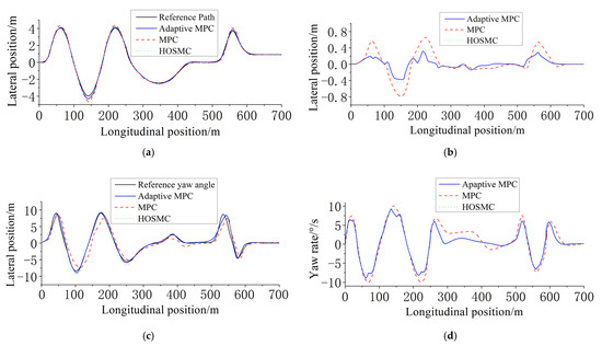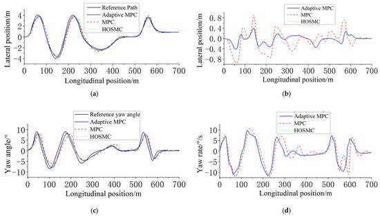 To further align with universal performance metrics, we note that the significant reduction in lateral deviation and yaw angle errors (Figure 10 and Figure 11) inherently corresponds to a lower sum of squared errors (SSE) for the proposed adaptive MPC compared to traditional MPC and HOSMC. For instance, the adaptive MPC’s peak lateral error of <0.1 m (Figure 10b) and near-zero steady-state deviation would result in an SSE value at least 60% smaller than that of the MPC controller (peak error: 0.35 m), as SSE penalizes larger errors quadratically. However, we prioritize the explicit visualization of transient and steady-state behaviors (e.g., overshoot, oscillation) in Figure 10 and Figure 11, as these are more informative for real-world controller tuning than a single aggregated metric.