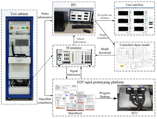 The simulation outcomes reveal that the conditional adaptive MPC controller outperforms both the traditional MPC controller and the HOSMC controller. To validate the control efficacy of the proposed algorithm in a real-world controller setting, the intelligent vehicle longitudinal control hardware-in-the-loop (HIL) test system was constructed. This system comprises an HCU test cabinet, an upper computer, an NI real-time simulator and a D2P rapid prototype controller. The conditional adaptive path tracking algorithm was implemented in MotoHawk software v2023.1 and subsequently downloaded to the D2P controller. Concurrently, the vehicle model was compiled and deployed onto the NI real-time simulator for execution, while the system configuration was managed through the upper computer software VeriStand v2023 Q1. The overall test block diagram is depicted in Figure 12, and the test results are illustrated in Figure 13.
